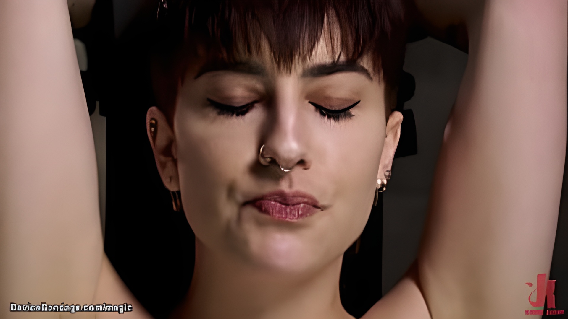 Pierced nose hairy pussy and armpits brunette slave Kristen Scott is bound in bdsm throne and whipped and fingered then on table fucked with dildo by master The Pope