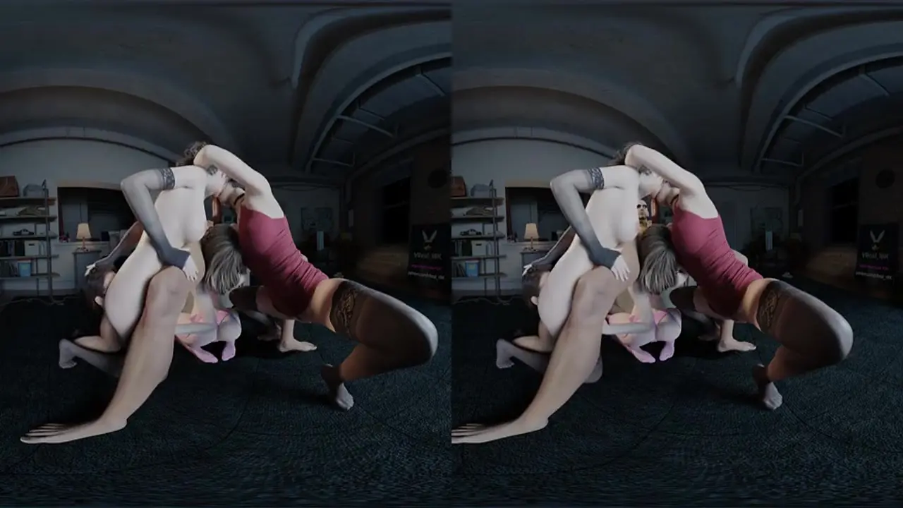 Claire and Ashley join a group sex session where they give sloppy blowjobs to big cocks. They also engage in ass rimming and licking each other's balls. The POV angle captures the action in an immersive VR experience, featuring the hottest sex acts from Resident Evil.