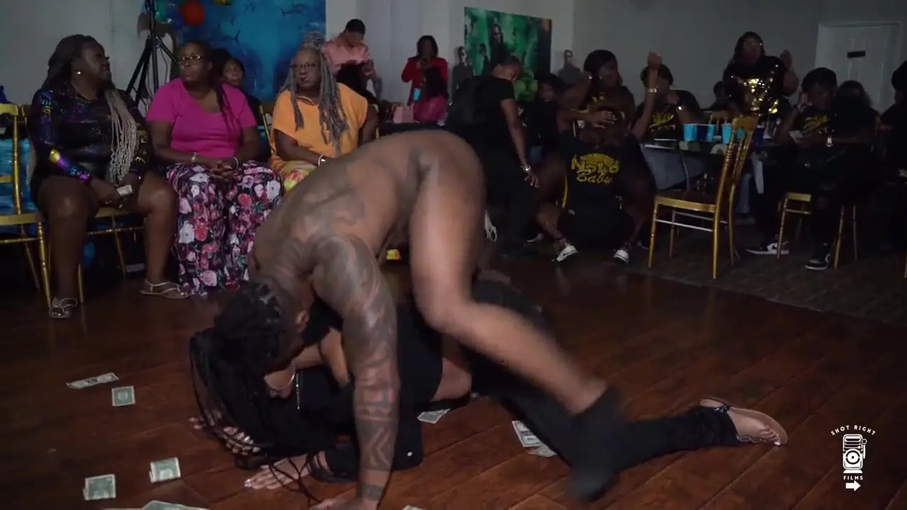 At a wild costume party, male strippers show off their big cocks and please an ebony MILF and BBW with their rough moves. The amateur women eagerly give oral pleasure while the men fuck them hard. The party turns into a public group orgy with lots of interracial action and anal fucking.